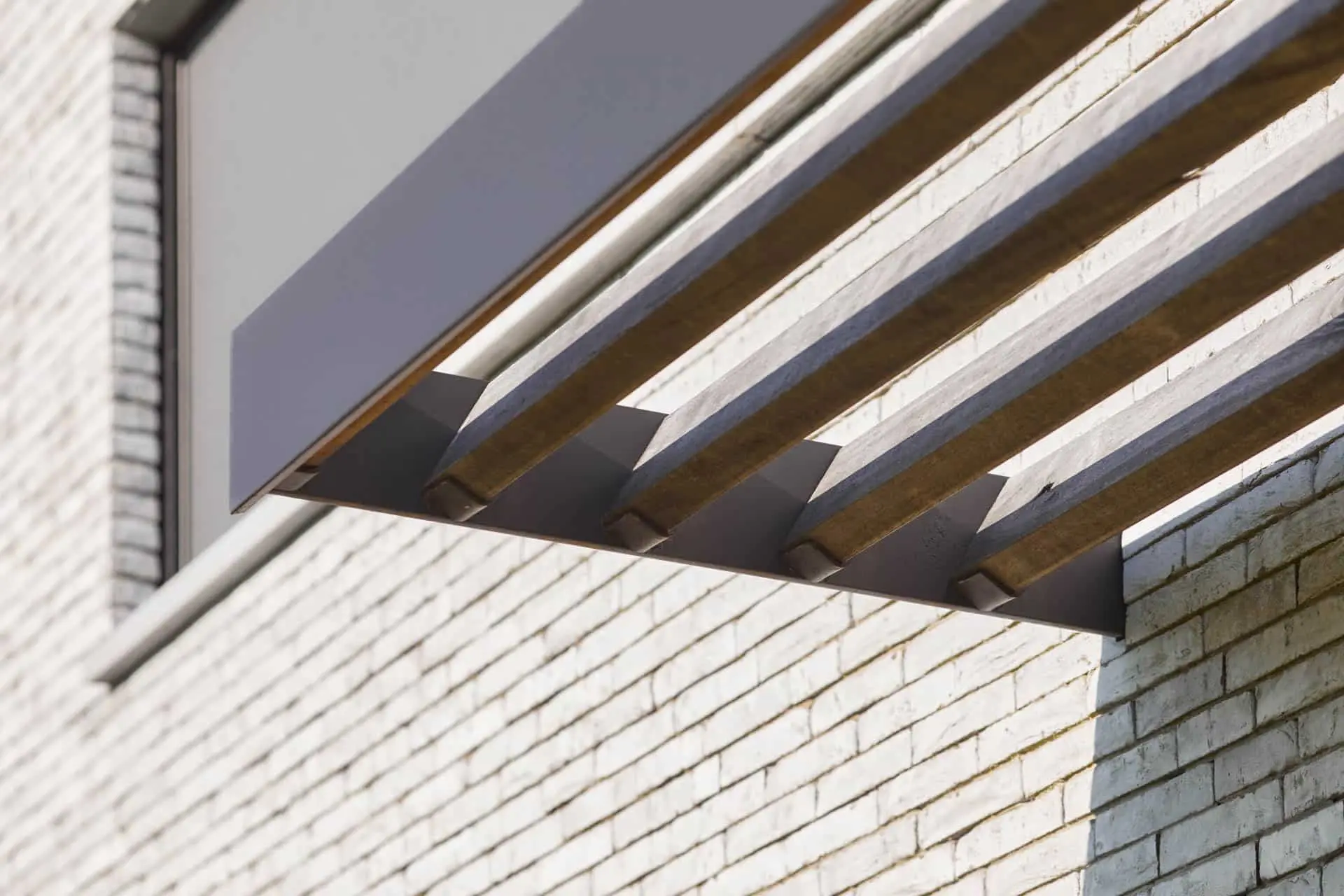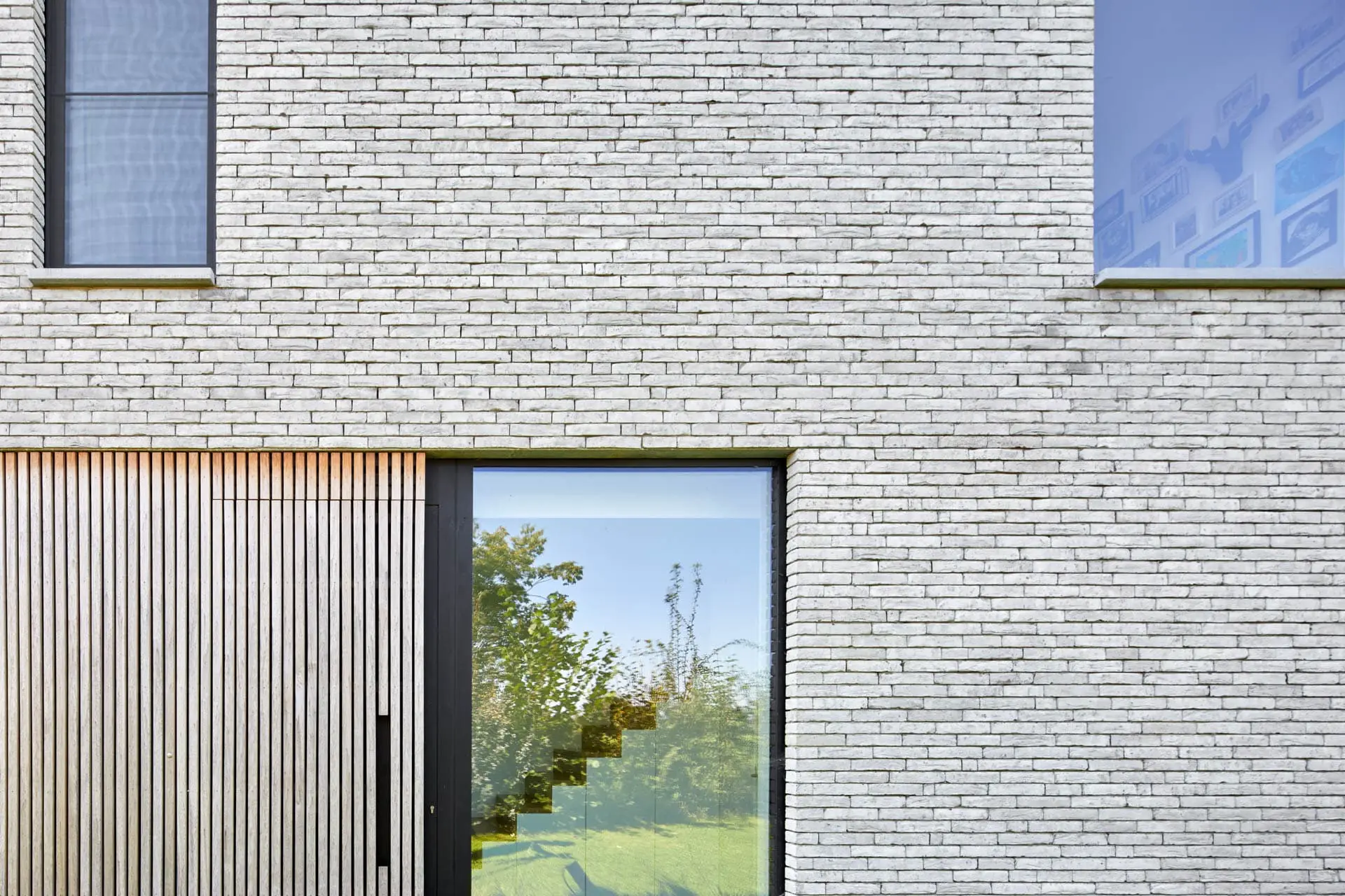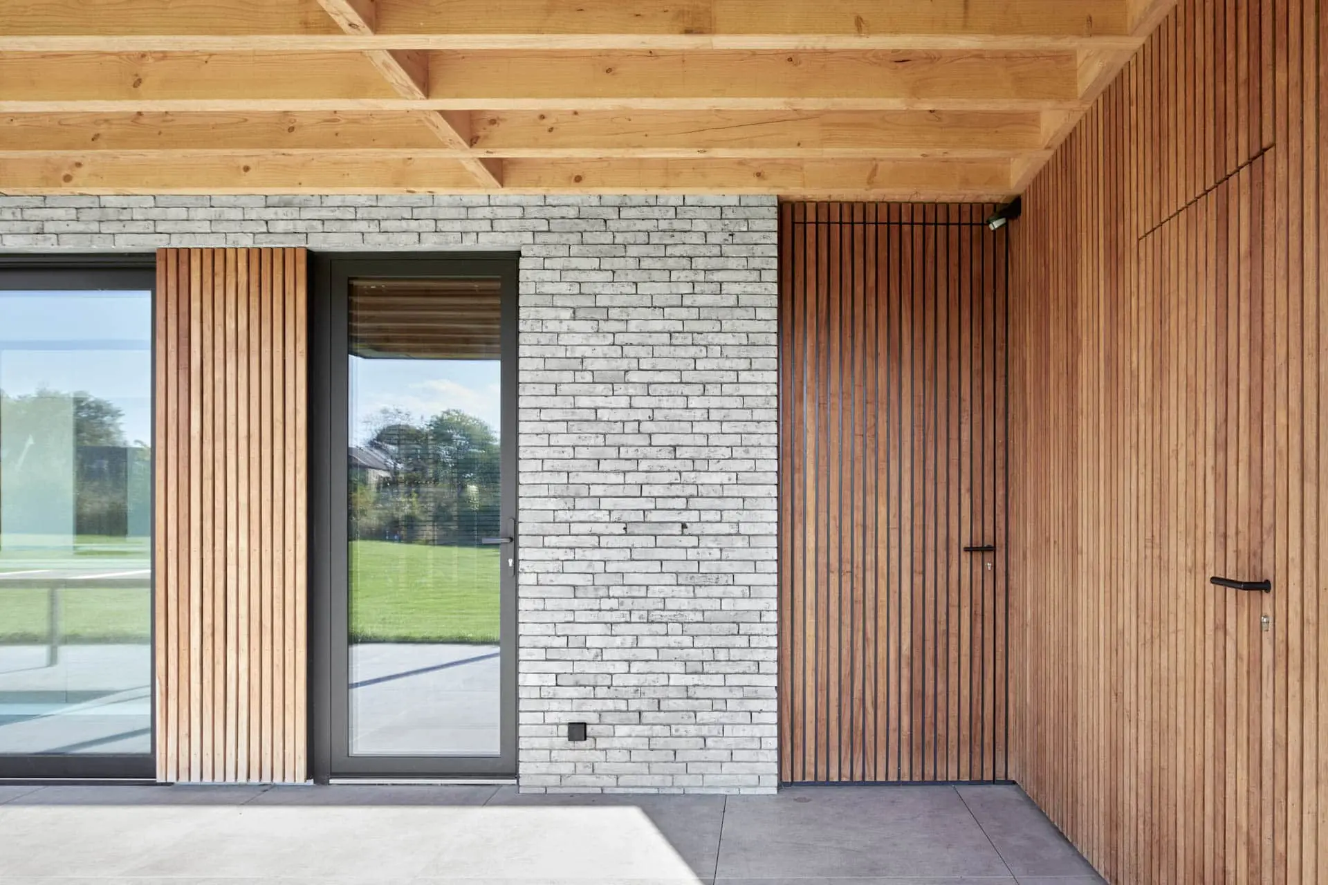 Brique collée grise sur bardage Cèdre – Claustras – aménagement intérieur